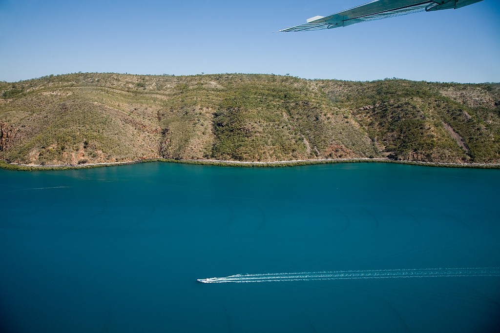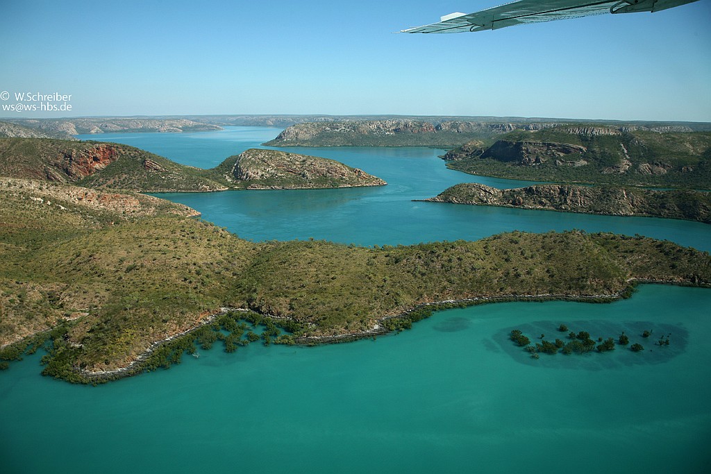 Oben: Hinter dem Bergrücken liegt die erste Buch der Horizontal Falls. Unten in dem Wasser werden Perlenzuchtfarmen betrieben. Unten: Entlag der Küste gibt es zahllose Inseln.