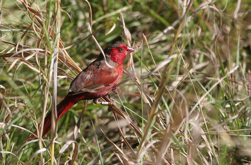 Crimson Finch. Viele von den Vögeln, die ich fotografierte waren beringt. Ein Zeichen für die intensive Forschungsarbeit in dem Camp.