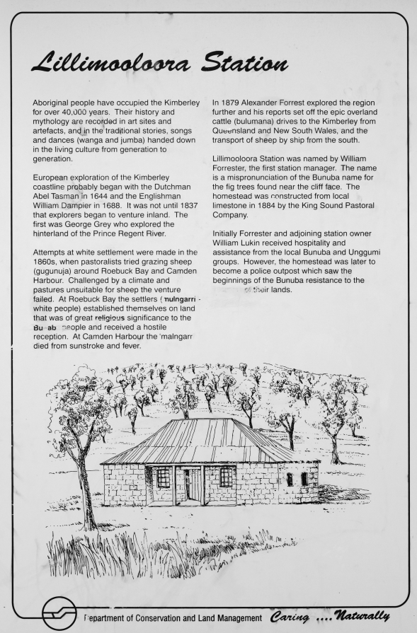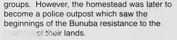 | Auf dieser und den folgenden Seiten sind die Infotafeln bei der Lillimooloora Station dokumentiert. Beschädigungen auf den Tafeln bzw. dem Gedenkstein zeugen davon, dass die Wunden aus dem 19. und 20. Jahrhundert längst nicht verheilt sind. Unten in die Lücke würde "Landraub" ganz gut passen, aber wahrscheinlcih war es etwas freundlicher ausgedrückt. |