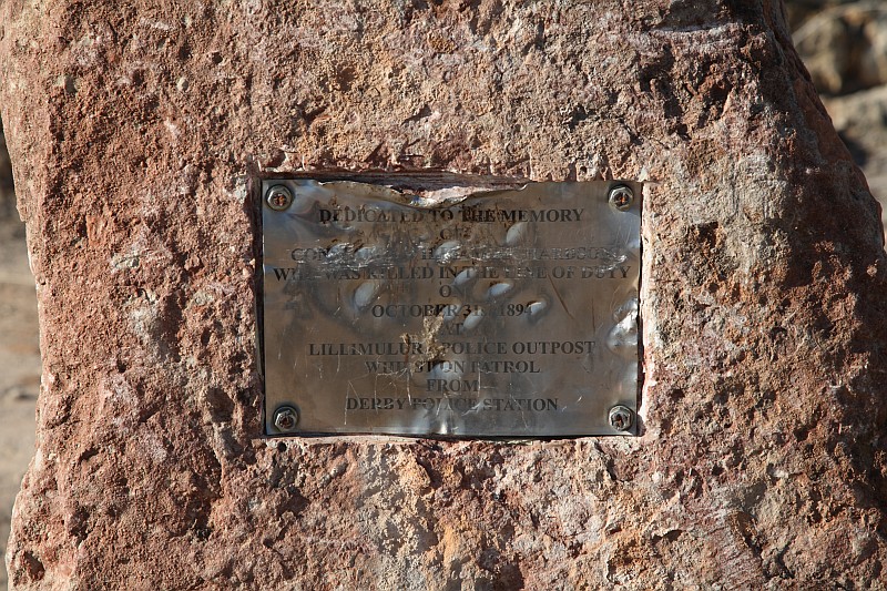 Gedenkstein für den erschossenen Polizisten William Richardson. Die Beschädigungen zeugen von der Wut, die bei einigen Menschen heute noch entsteht angesichts eines solchen Gedenksteins. Immerhin gibt es für Jandamarra beim Tunnel Creek, wo er umgebracht wurde, auch einen Gedenkstein. Wer sich für Jandamarra oder die Bunuba näher interessiert wird über eine Suchmaschine im Internet schnell fündig (Stichwort "Jandamarra"). Wikipedia.de: Jandamarra |
