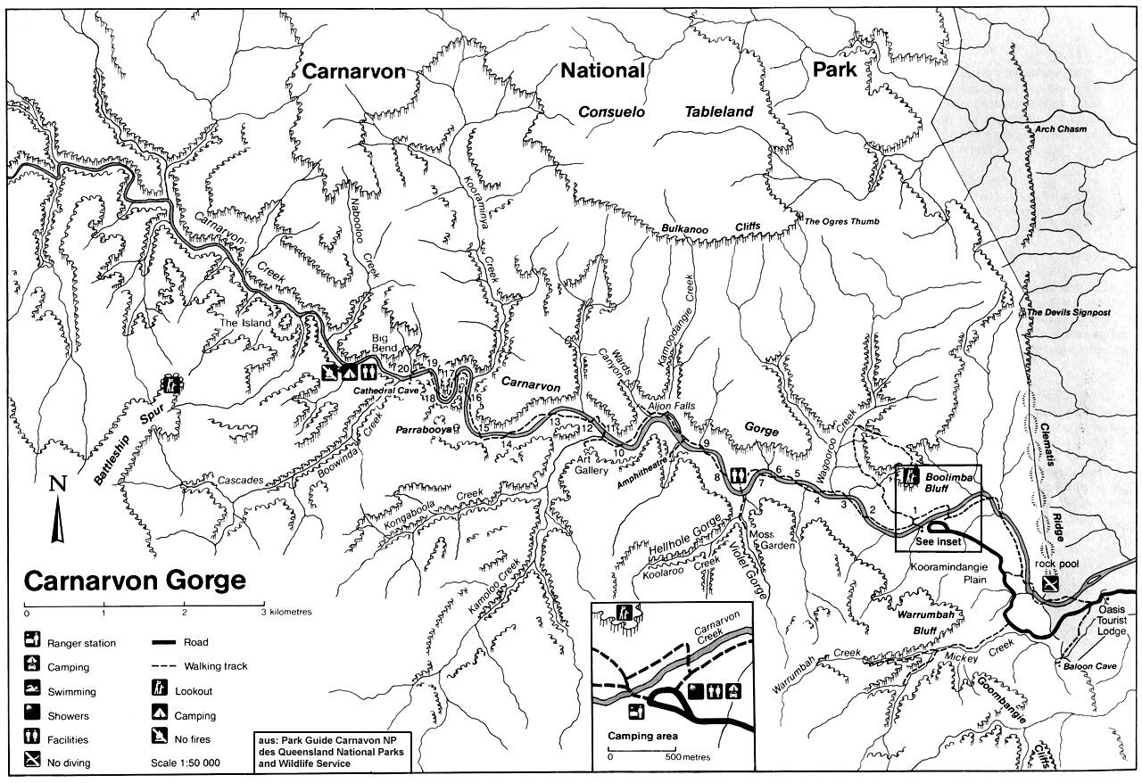 Carnarvon Nationalpark Karte mit den Wanderwegen (aus: Park guide. Carnavon Gorge Section, des Queensland National Parks and Wildlife Service)
