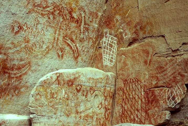 Wunderschöne Felsmalereien in der Sprühtechnik (Hände, Emufüße, Bumerangs ...). In der Carnavon Gorge hat man Felsmalereien gefunden, die wahrscheinlich älter als 19.000 Jahre sind.