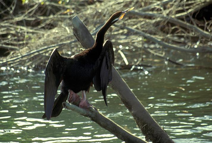 Der Schlangenhalsvogel (Darter) trocknet sein Gefieder.