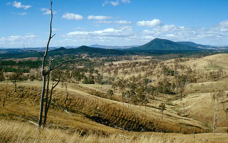 Auf dem Weg zum Lamington Nationalpark Weideland, auf dem die Eukalyptusbäume nach und nach absterben.