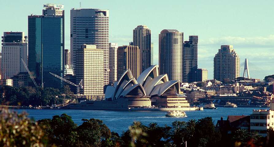 Sydney Der Hafen von Sydney mit der Oper und dem Hochhausviertel - vom Taronga Zoo aus fotografiert .