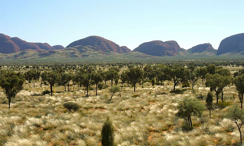 Ein "Wald" von Desert Oaks vor den Olgas.