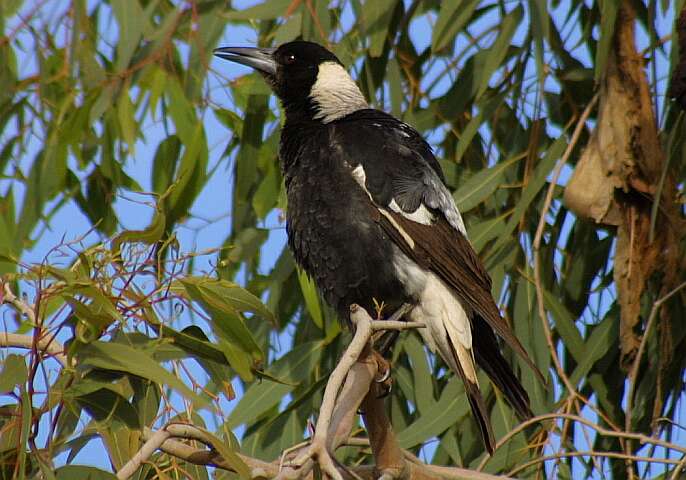 Ein Australian Magpie in einem Eukalyptusbaum.