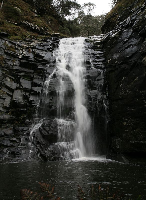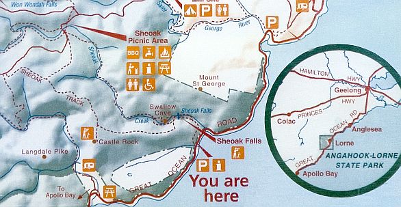 | Sheoak Falls. Das Sheoak River Valley ist das Herz des Angahook-Lorne State Parks. Der untere Kartenausschnitt zeigt die Lage des Wasserfalls. Der State Park wird durch zahlreiche Wanderwege durchzogen. Die Gesamtkarte von der offiziellen Infotafel auf dem Parkplatz beim Sheoak-Wasserfall: hier