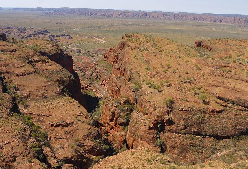 Blick in eine Schlucht und die flache Ebene, die mit dem Erosionsmaterial aufgefüllt ist.