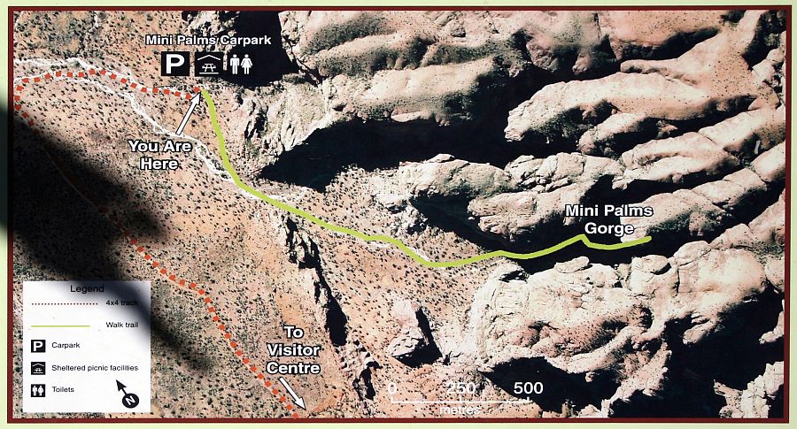 | Karte zur Mini Palms Gorge. Der längste Teil des Weges führt durch offenes Gelände mit Spinnifex, Büschen und Bäumen bzw. durch das trockene Flussbett. Am Anfang der Schlucht versperren große Felsbrocken den Weg, sodass man sich durch teilweise zwischen ihnen hindurch quetschen muss. Das könnte bei sehr korpulenten Personen schwierig werden. |