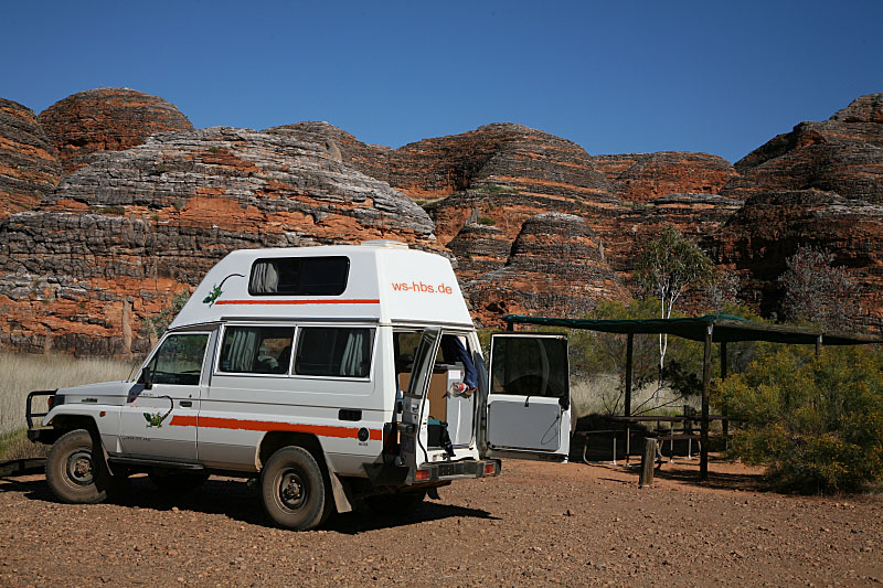 | Parkplatz in der Nähe des Piccaninny Creek. Im Hintergrund die als "Bienenkörbe" bekannte Felsformation. Das Gestein dieser Buckel verwitter sehr schnell, allerdings bildet sich mit Hilfe von Mikroorganismen und dem aus dem Sandstein sichernden Wasser eine relativ wiederstandsfähige Schutzschicht. Um diese nicht zu zerstören, ist es nicht erlaubt, die "Bienenkörbe" zu besteigen. |