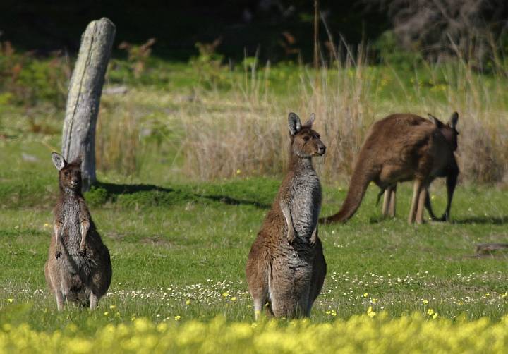 Die Känkurus grasten auf einer Rinderweide und ließen sich durch uns kaum stören.