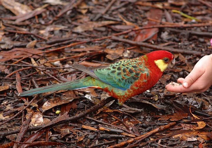 Western Rosella fressen beim Gloucester Tree aus der Hand.
