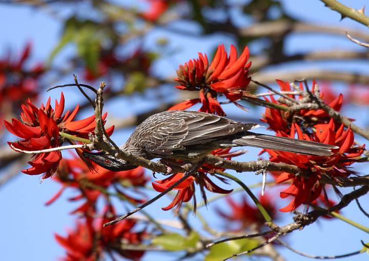 In diesem Baum tummelten sich mehrere Honeyeater, u.a. dieser Wattlebird, der recht gelenkig zu sein scheint.