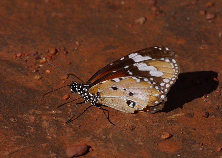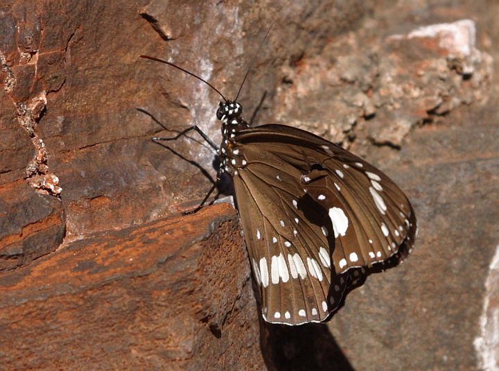 Zwei Schmetterlinge der Familie Nymphalidae: oben ein Crow Butterfly (Europloea core corinna); unten ein Lesser Wanderer (Danaus chrysippus petilia).