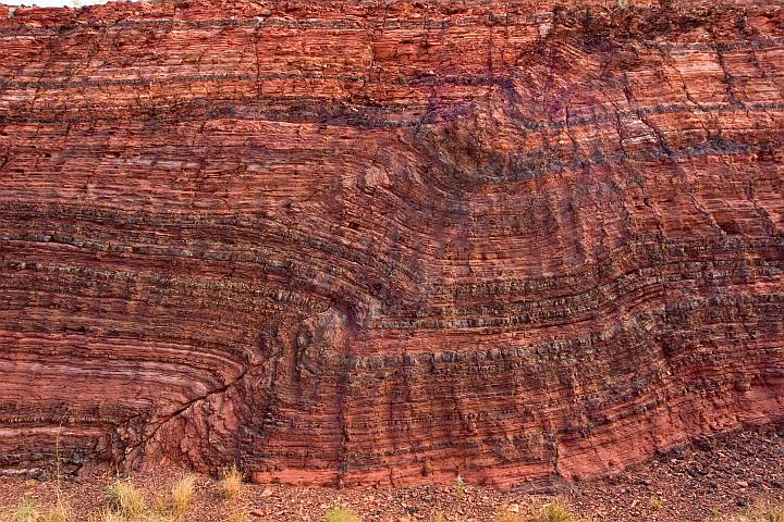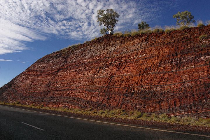 Bei Straßenbauarbeiten freigelegte "banded iron formation" am Highway.