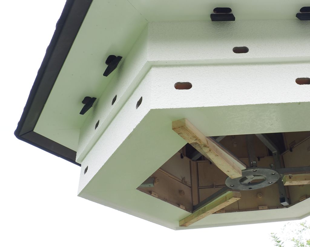 ![]() Ein Blick in das Mauerseglerhaus. Die Rückwände der Nisthöhlen können zur Wartung werkzeugfrei geöffnet werden. |