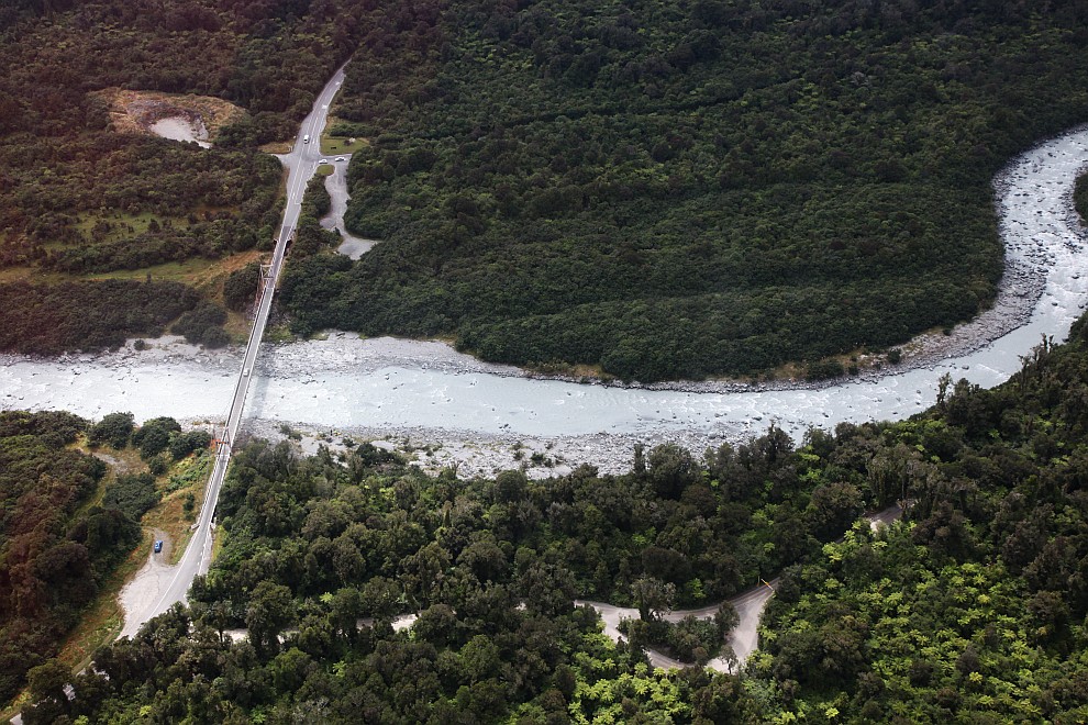 Im Hintergrund in einer kleinen Wolkenlücke ist der Mount Cook zu sehen. Der Mount Tasman (Mitte) und der Mount Cook (rechts, ganz hinten). Der Fox River aus der Vogelperspektive.