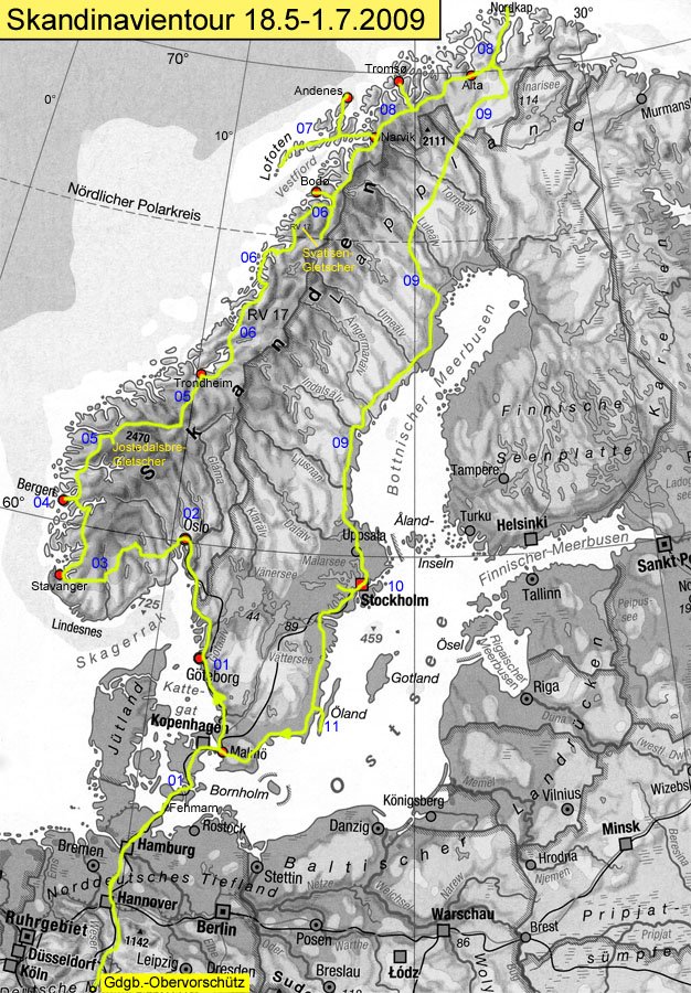 über den Hafen. Der Campingplatz Bogstad liegt im Nordwesten Oslos und hat eine schöne Lage. Zwar sind Sanitäreinrichtungen besser als auf dem letzten, doch auch hier gibt es einiges zu kritisieren. Ad 1 haben sie uns auf einen Platz geschickt, wo der Strom abgestellt war. Das brachte schon mal einige Lauferei mit sich. Ad 2: Wenn ich schon 300 NK für den Platz bezahle (fast 40 €), sollte das Duschen zumindest enthalten sein. In den Duschen gab es noch nicht einmal eine Sitzgelegenheit. Ad 3: die Kabine zum Entleeren der Toilettenkassetten war total versifft. Die öffentlich verfügbaren Dumpingstationen sind da wesentlich angenehmer. Ad 4: Es gab keine Möglichkeit das Abwasser (Küche und Dusche) zu entsorgen. Km-Stand abends: 9.858 |