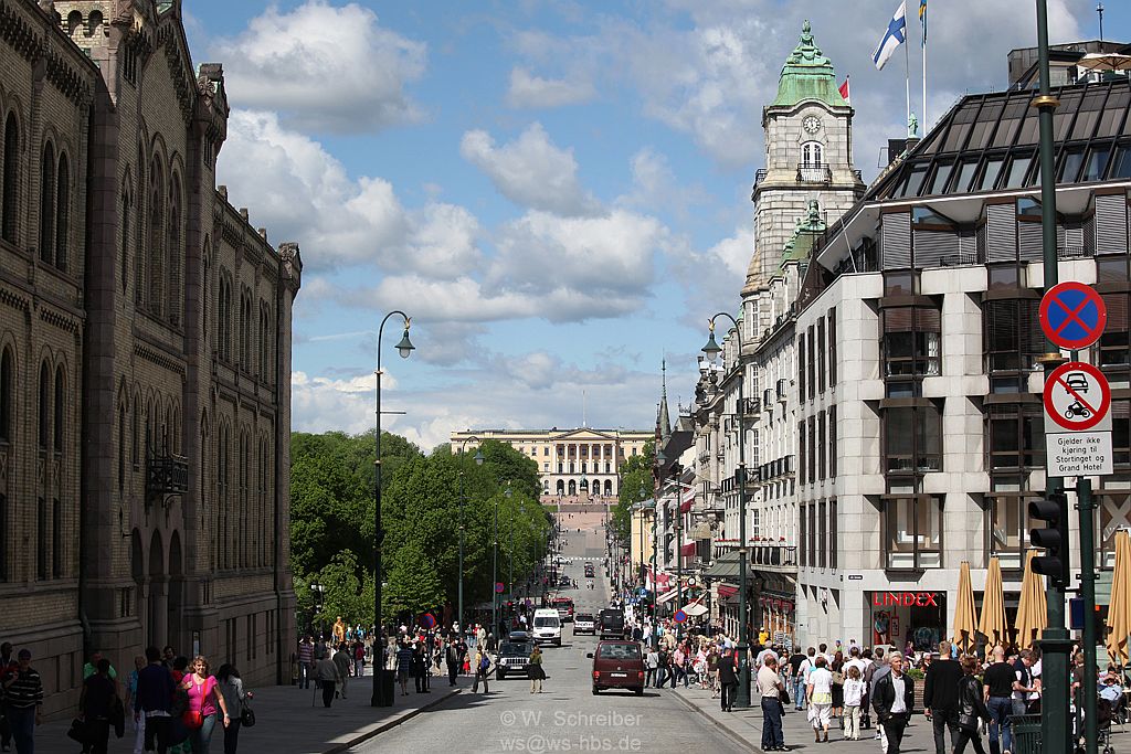 Karl Johans Gate mit Blick auf das königliche Schloss. Links von den Bäumen geht es zum Hafen.