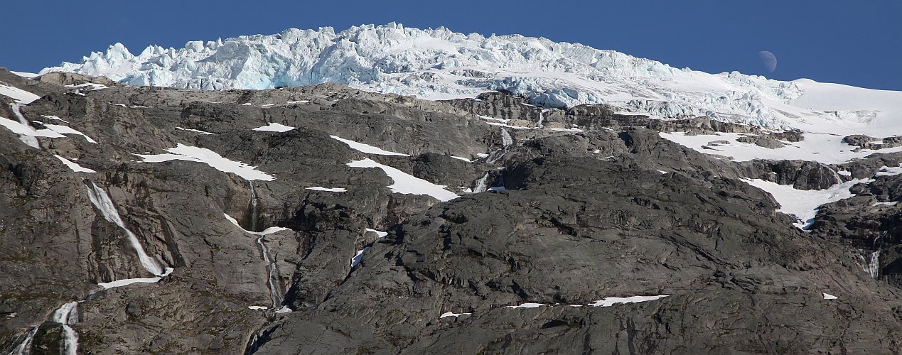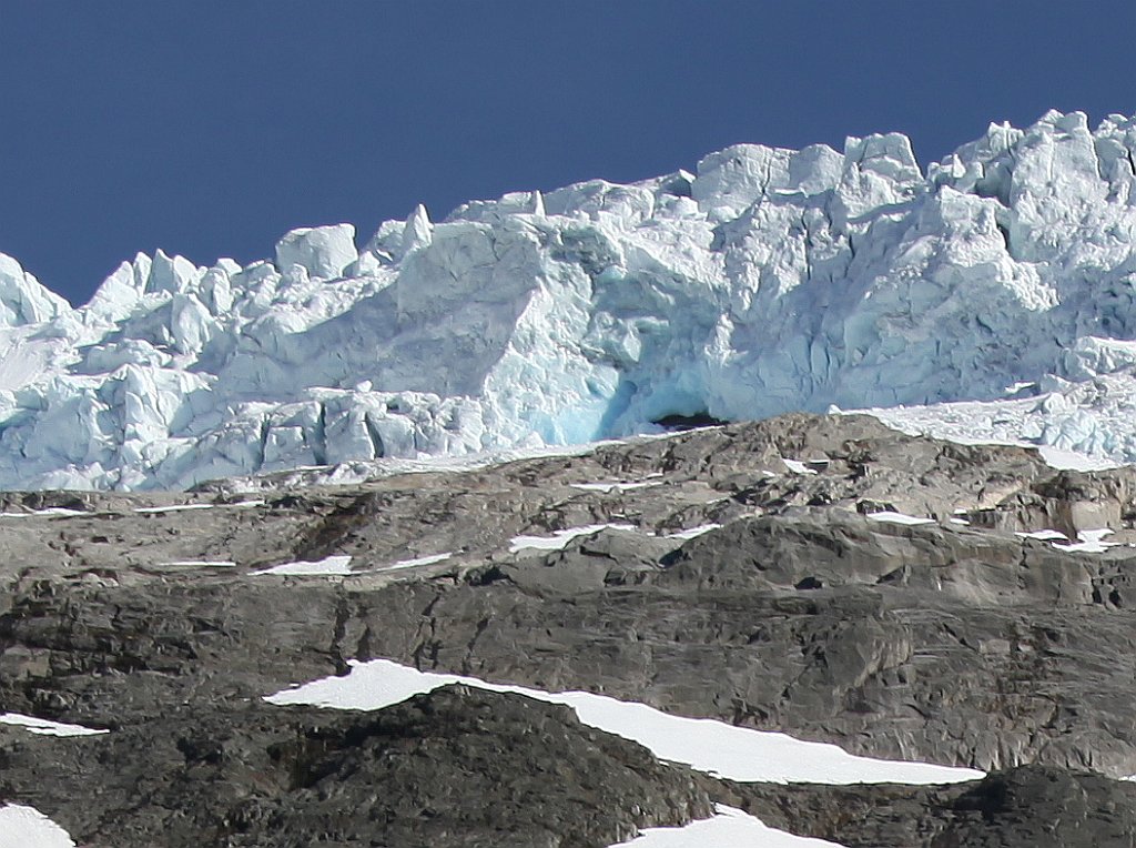 090531-7944 - Überhängendes Gletschereis; man sieht noch soeben das Gletschertor und links unten das daraus abfließende Wasser.