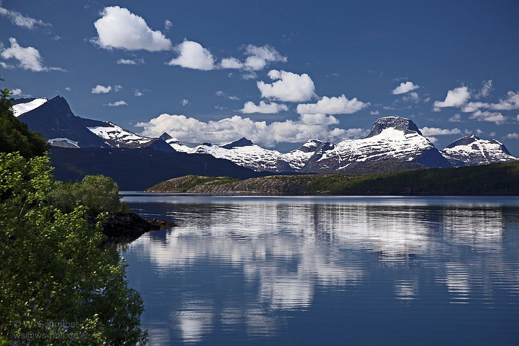 10.06.2009 Auf der E6 Richtung Narvik Heute haben wir besonders lange geschlafen: bis um 8:30. Trotzdem verlassen wir schon um 10 Uhr den Campingplatz. In Fauske versuche ich noch einen neuen Blasebalg zu bekommen, denn mein alter hatte einen riesigen Riss. Es gab zwar in Fauske einen Fotografen, doch einen Blasebalg hatte der nicht. Auf dem Sensor der Canon hatten sich nämlich einige große Staubpartikel abgesetzt. Naja, nächster Versuch in Narvik. Wetter und Landschaft präsentieren sich wieder von der besten Seite. Die Landschaften sind wieder ganz anders als vorher. Fjorde, schroffe Berge, teilweise wie senkrecht abgeschnitten oder riesige wie poliert wirkende Felswände und Schneefelder, die immer weiter nach unten kommen. Überall zeigen sich noch die Spuren der jüngsten Eiszeit. Von der Fähre über den Tysfjord konnte man das Panorama der Berge besonders gut genießen. 30 km vor Narvik quartieren wir uns auf einem Campingplatz (Ballangen Camping) ein. Km-Stand: 13.053