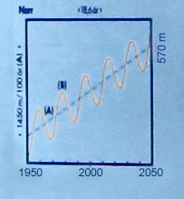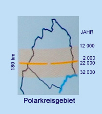 Der Polarkreis wandertDer Polarkreis ist die südlichste geographische Breite (Nordhalbkugel), wo die Mitternachtssonne bei der Sommersonnenwende sichtbar ist. Seine Position wird durch die Neigung der Erdachse definiert, die sich unter Einwirkung der Sonne, des Mondes und der Planeten verändert. Während einer Periode von 40 000 Jahren bewegt sich der Polarkreis innerhalb eines Bereichs von 180 km nach Süden und nach Norden. Innerhalb einer Periode von 18,6 Jahren bewegt er sich außerdem innerhalb eines Bereichs von 570 m. Im Jahr 12 000 wird der Polarkreis seine nördlichste Position erreichen, kommt im Jahr 22 000 an seine heutige Position zurück, um im Jahr 32 000 an seine südlichste Position zu gelangen usw.[Text und Grafiken sind den Infotafeln entnommen (s.o.)]. |